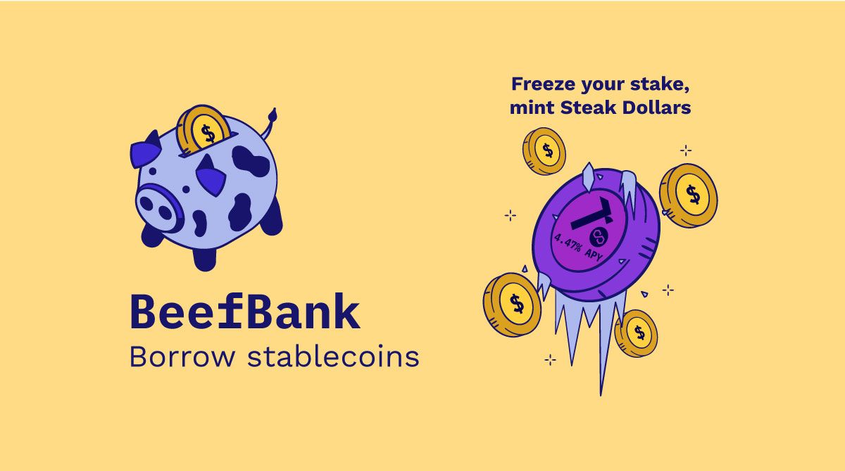 Users deposit collateral into BeefBank to mint Steaks Dollar (SD)- an over-collateralized, LST-backed stablecoin. It is the first-of-a-kind decentralized stablecoin backed by a basket of various liquid staked assets. SD is generated by locking in collateral to create a Collateralized Debt Position (CDP). The value of the collateral in a CDP exceeds the value of the debt to prevent liquidation. CDPs don’t rely on external liquidity providers to act as lenders. Creating new debt positions increases the SD supply, where repayment of debt contracts the SD supply.